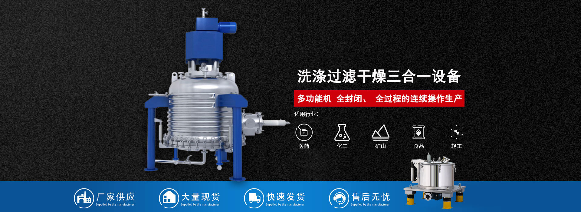 該設(shè)備可以對(duì)制藥原料進(jìn)行過(guò)濾、洗滌和干燥處理,如制藥廠(chǎng)、醫(yī)療器械廠(chǎng)等